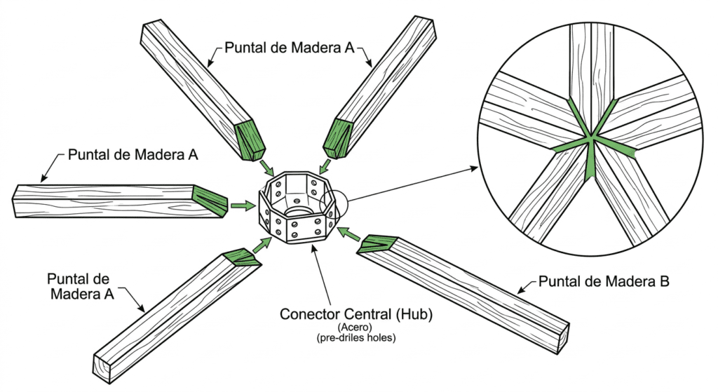 Esta ilustración es fundamental para la Fase 4 (Ensamblaje y Montaje). Muestra cómo se unen los puntales (struts) cortados con precisión en un conector central (hub). Esta imagen es clave para que el usuario visualice el momento crítico en que la estructura se vuelve auto-soportada a medida que se van formando y cerrando los triángulos de madera.