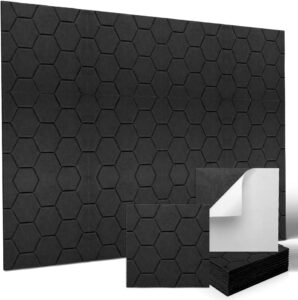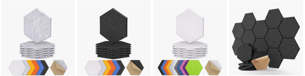 - Aprovechamiento del Espacio: Los paneles hexagonales encajan perfectamente entre sí sin dejar huecos, maximizando la superficie de absorción en los puntos críticos de reflexión (como las paredes laterales a la altura de tus oídos).